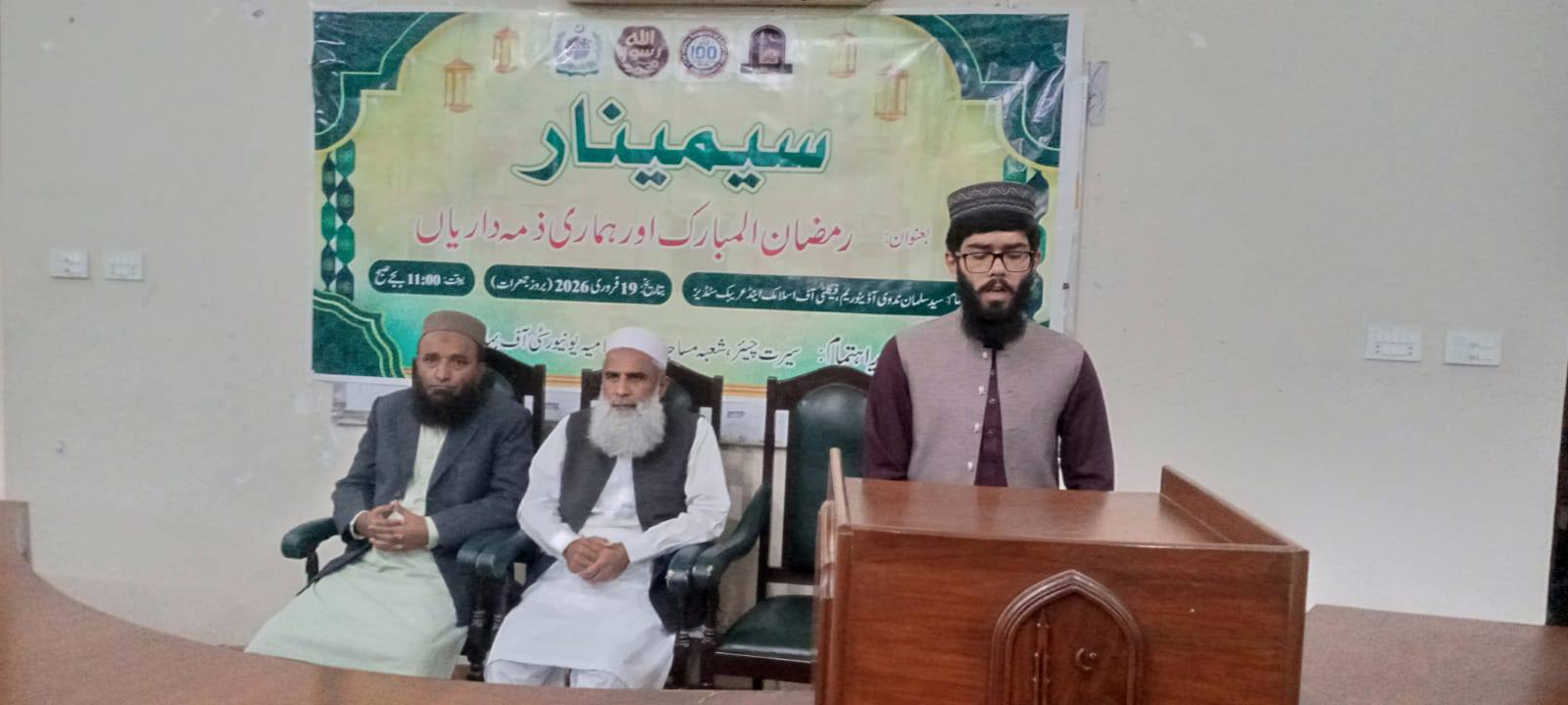 On February 19, 2026, the Seerat Chair and the Directorate of Mosques hosted a seminar titled "Ramadan and Our Responsibilities" at the Syed Salman Nadvi Auditorium, Faculty of Islamic and Arabic Studies.
