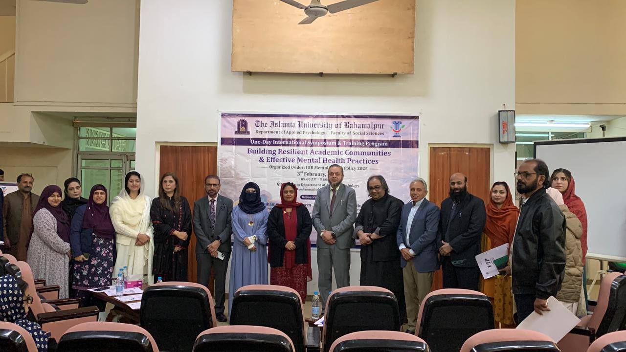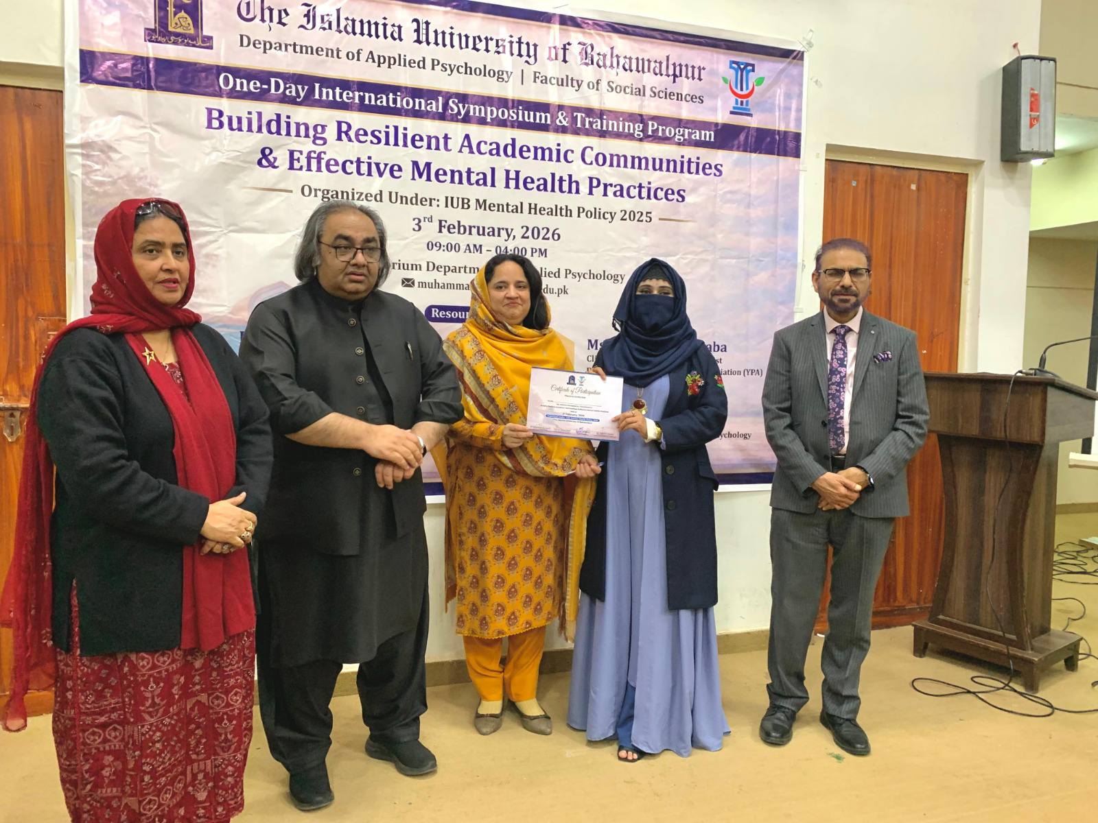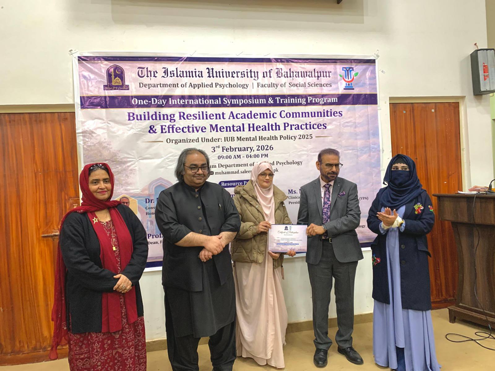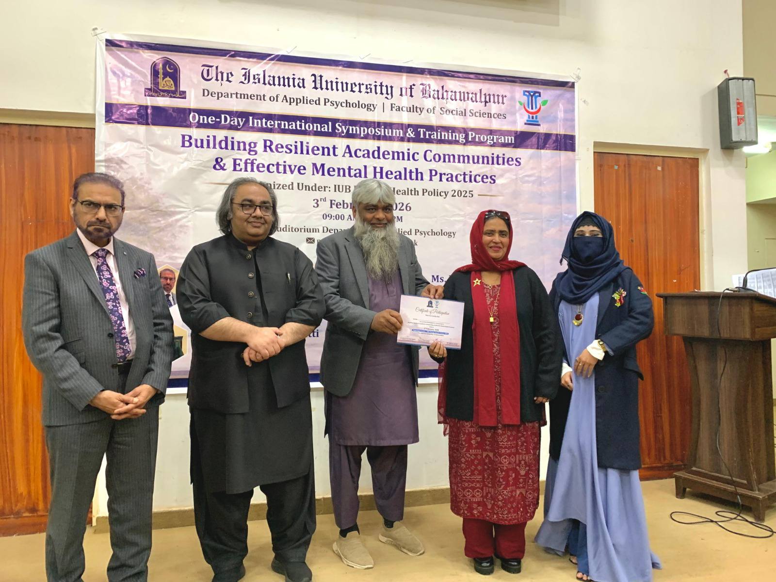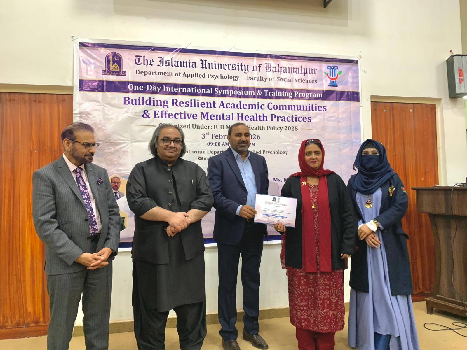 The Department of Applied Psychology, The Islamia University of Bahawalpur (IUB), successfully organized an International Symposium and Training Day on Mental Health on 3rd February 2026, under the umbrella of the IUB Mental Health Policy 2025 (V.1.0)—a landmark initiative marking the launch of the first ever Institutional Mental Health Policy at IUB.