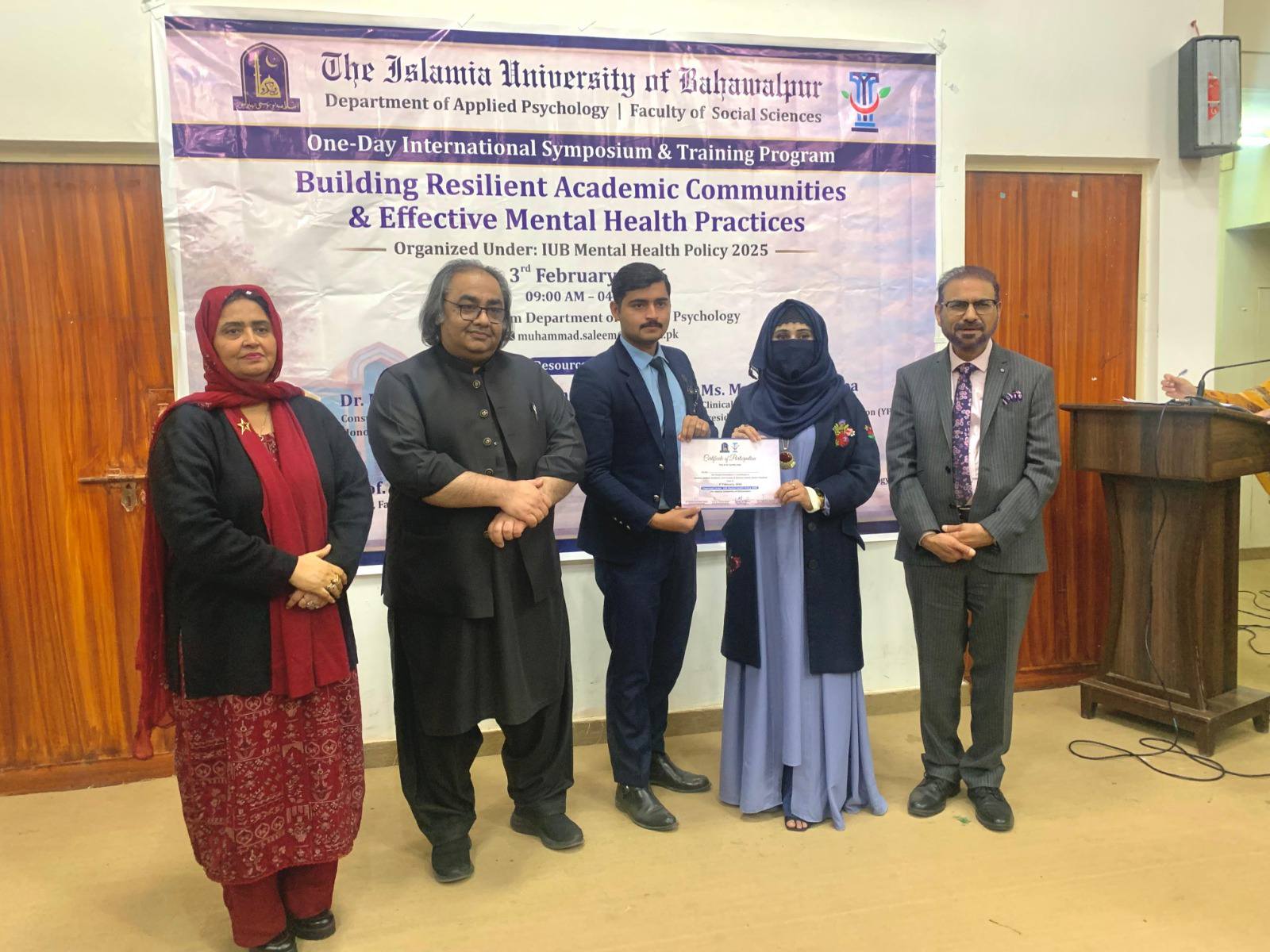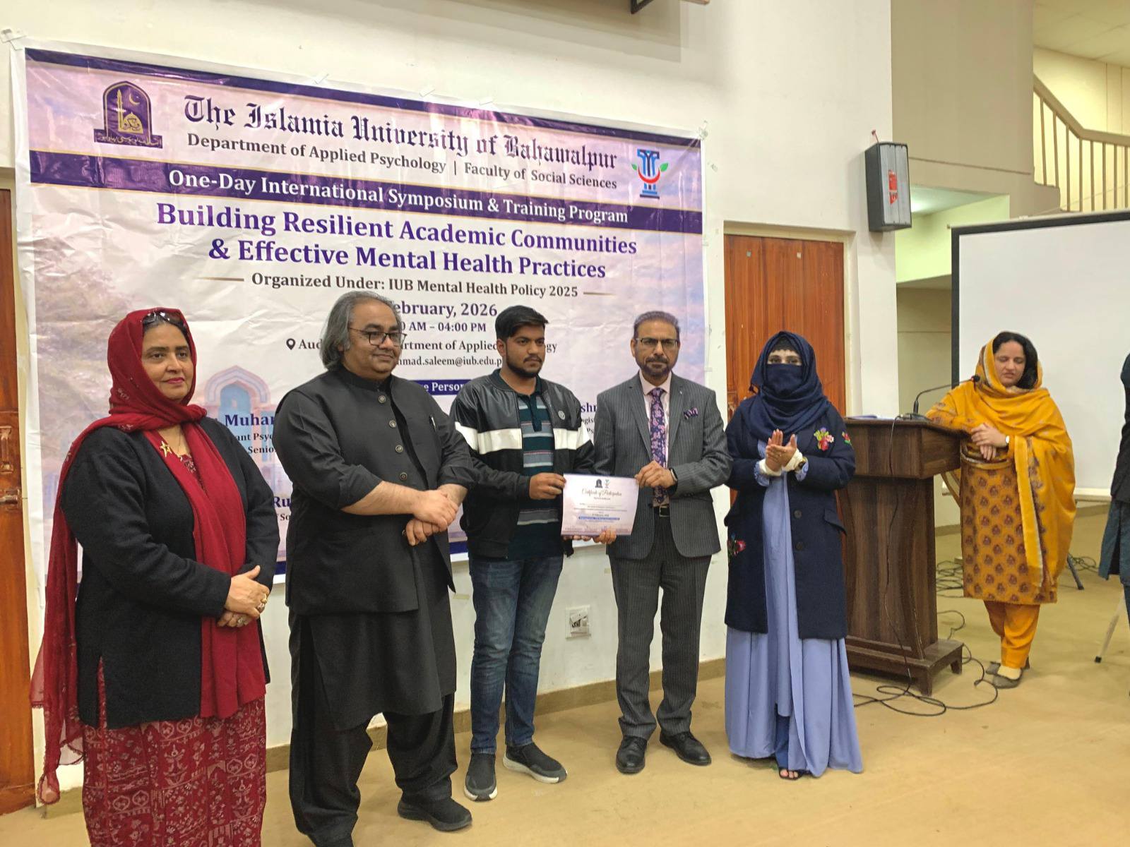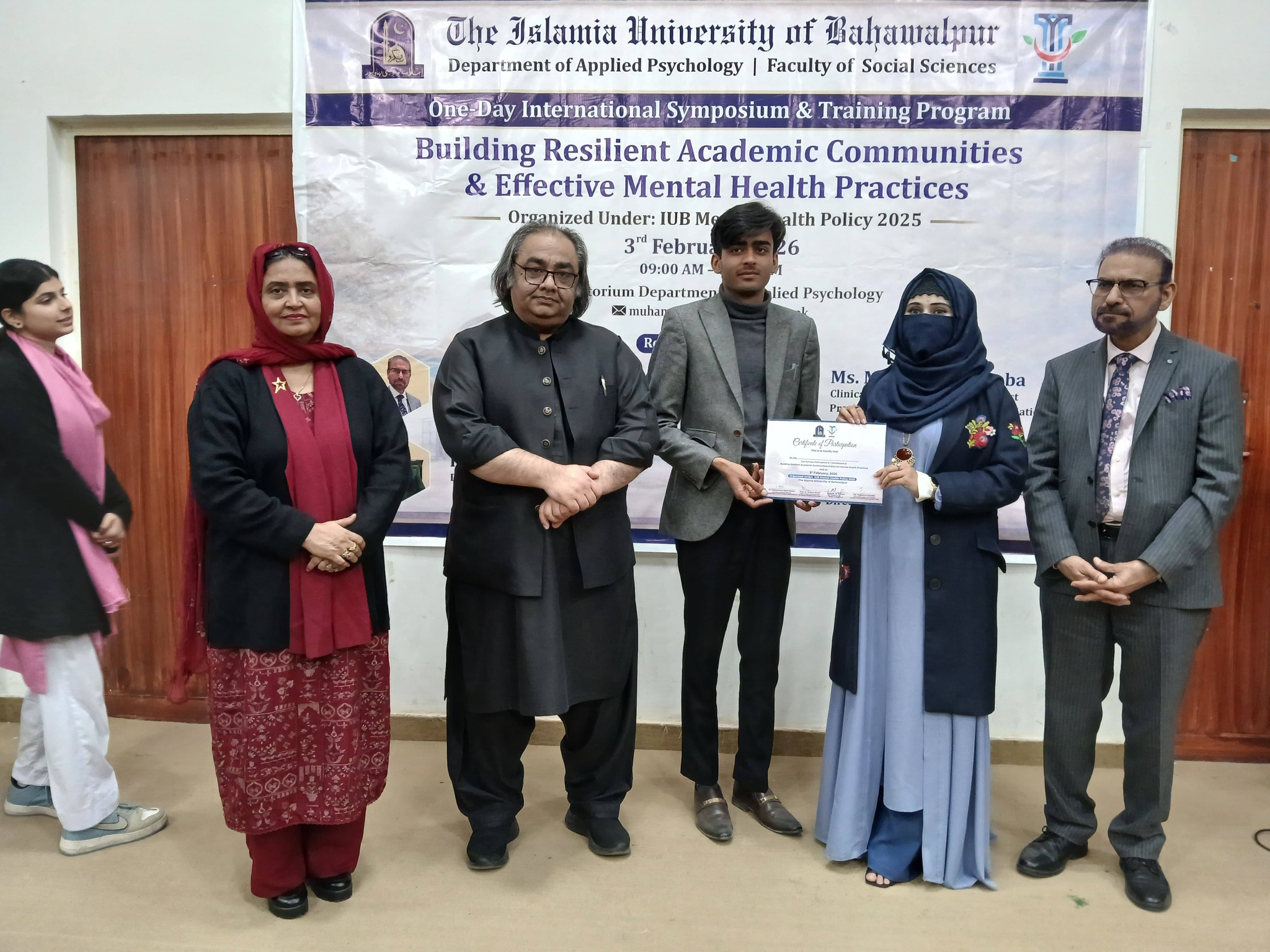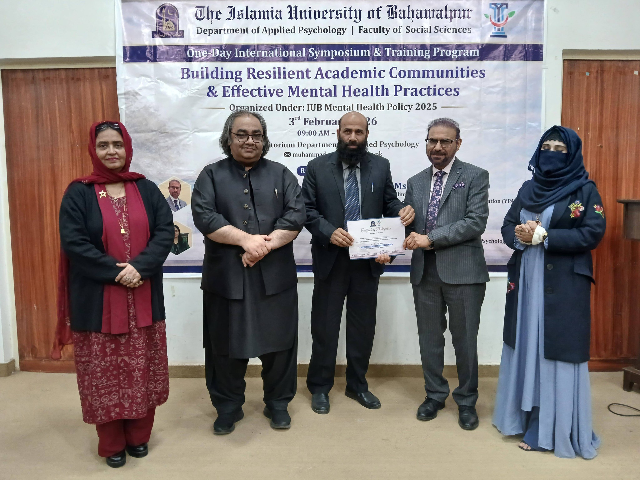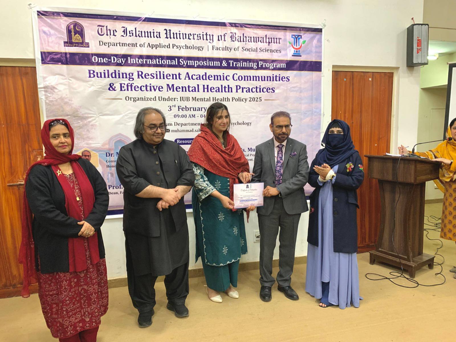 The Department of Applied Psychology, The Islamia University of Bahawalpur (IUB), successfully organized an International Symposium and Training Day on Mental Health on 3rd February 2026, under the umbrella of the IUB Mental Health Policy 2025 (V.1.0)—a landmark initiative marking the launch of the first ever Institutional Mental Health Policy at IUB.