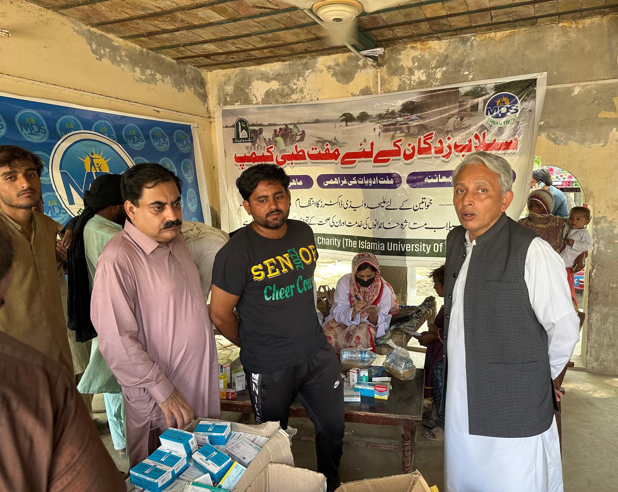 The IUB Flood Relief Cell distributed relief goods in Jalalpur Pirwala Tehsil. A team from the Islamia University of Bahawalpur's flood relief cell led by the focal person Prof. Dr. Asif Naveed Ranjha went to Haji Pul Tehsil Jalalpur Pirwala where medical, veterinary, and volunteers distributed medicines, dry rations, mosquito nets, clothes and cooked food.