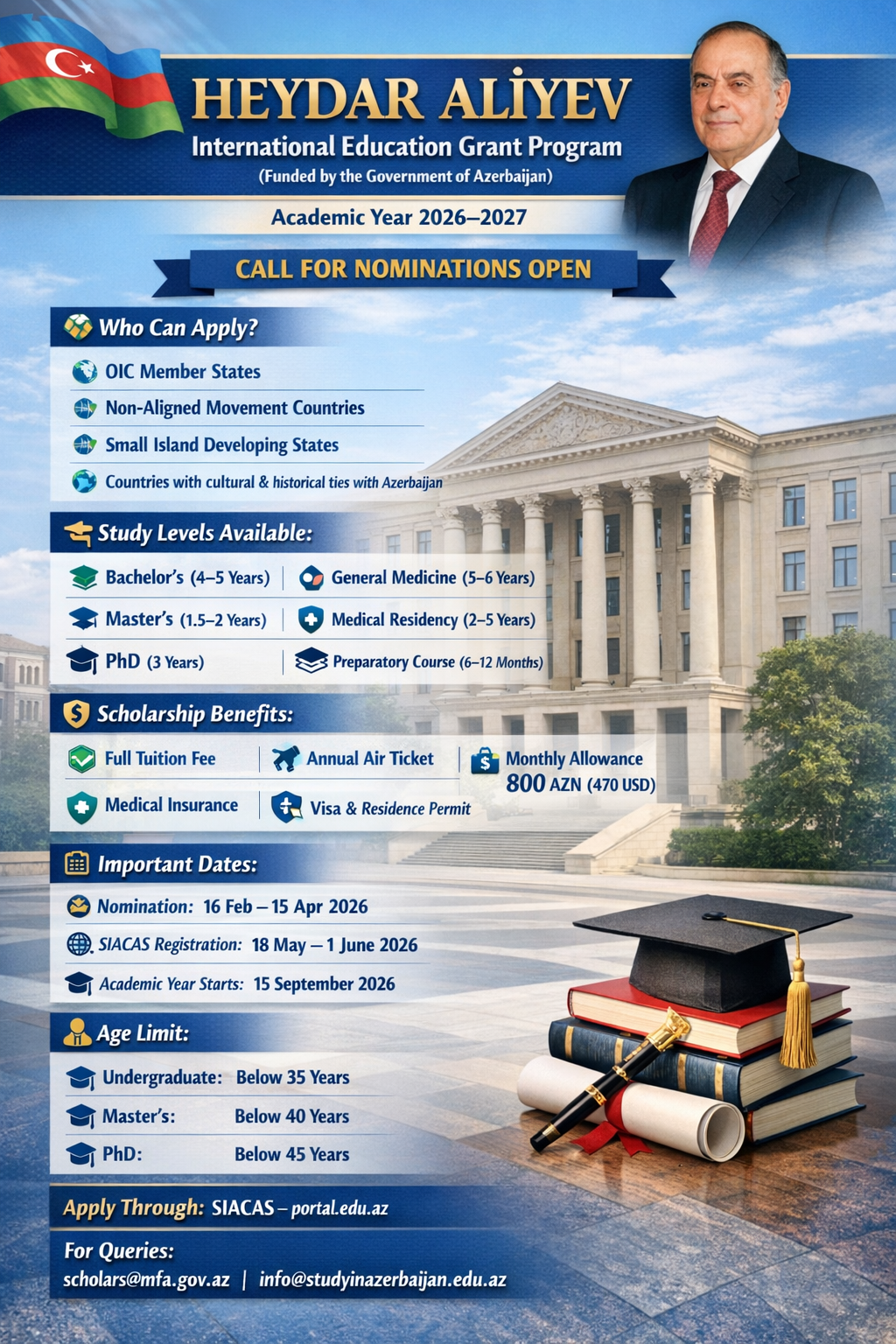 How to Apply: 1st email the embassy for nomination then apply on the SIACAS website (portal.edu.az)