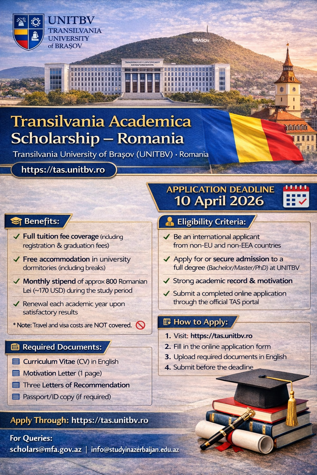 Benefits: Full tuition fee coverage+Accommodation+monthly allowance of 800 lei