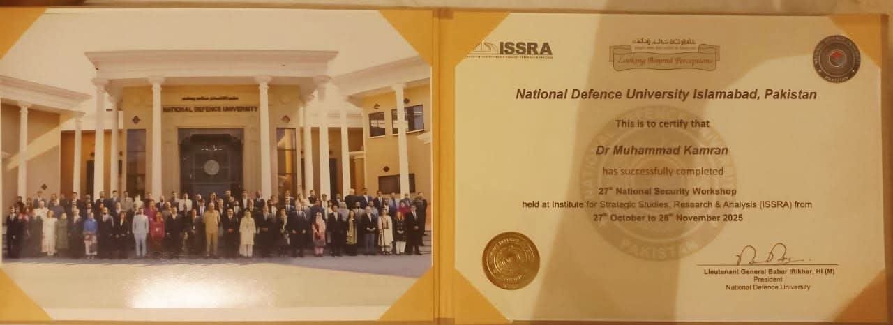 Vice Chancellor the Islamia University of Bahawalpur Prof. Dr. Muhammad Kamran attended the month-long 27th National Security Workshop organized by National Defense University Islamabad. At the end of the workshop, President of Pakistan Asif Ali Zardari presented a certificate to Prof. Dr. Muhammad Kamran. On this occasion, First Lady, Member National Assembly Asifa Bhutto Zardari and Lieutenant General Babar Iftikhar and President National Defense University were also present. This security workshop was organized by the Institute for Strategic Studies, Research and Analysis from October 27 to November 28.