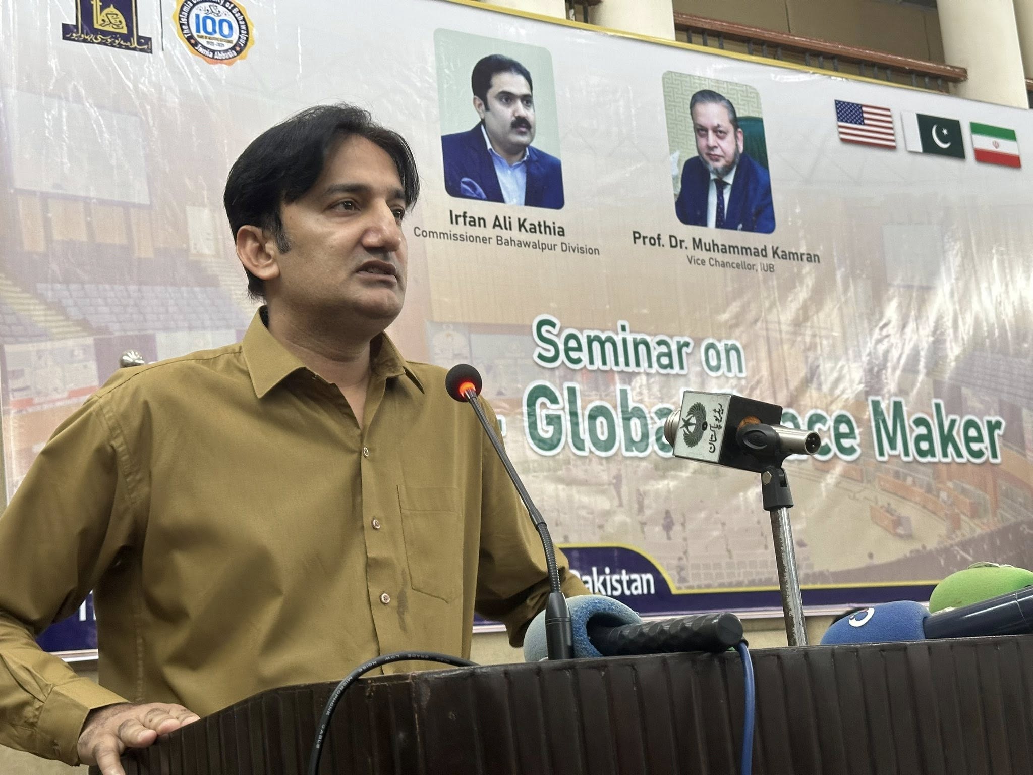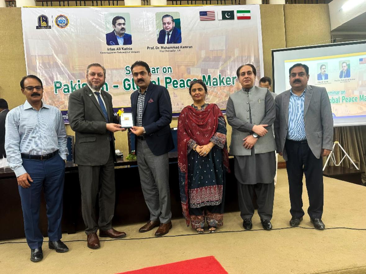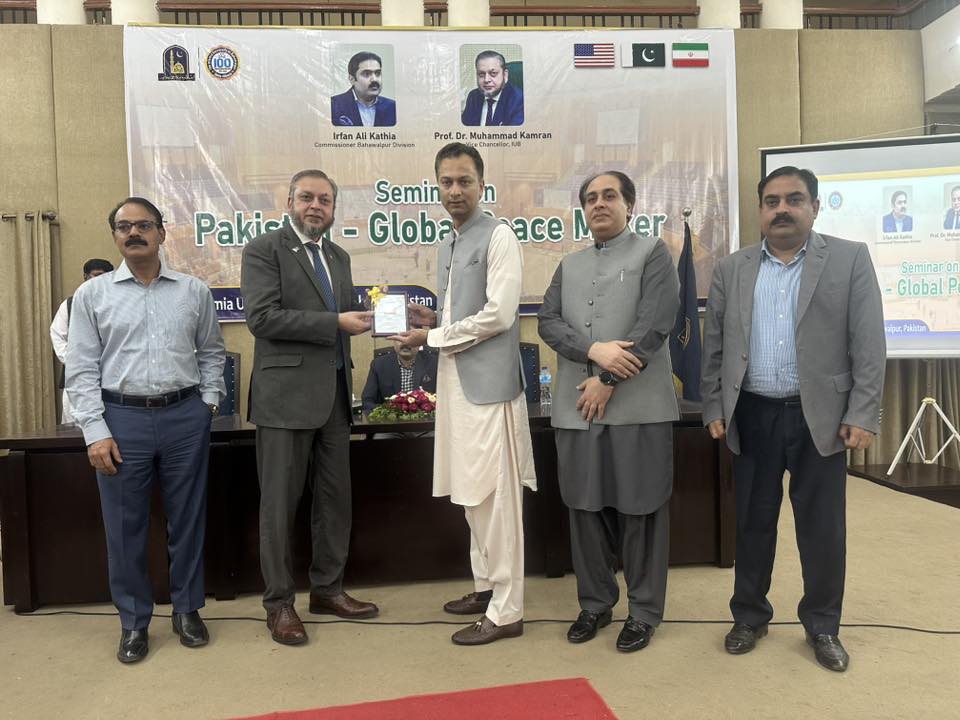 15 April 2026: A seminar titled Pakistan Global Peacemaker was held at Ghulam Muhammad Ghotvi Hall Abbasia Campus Islamia University of Bahawalpur. Commissioner Bahawalpur Division Irfan Ali Kathia was the chief guest while Vice Chancellor Prof. Dr. Muhammad Kamran presided over the seminar.