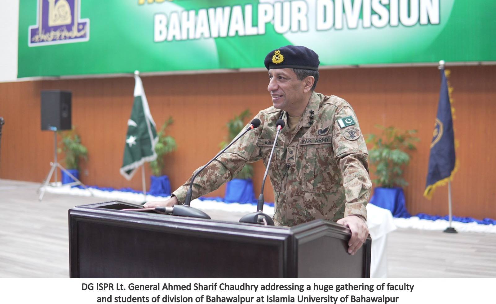 DG ISPR Lt. Gen. Ahmed Sharif Chaudhry addressed participants from educational institutions at IUB.
