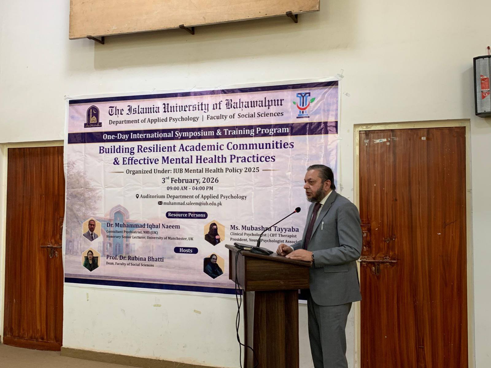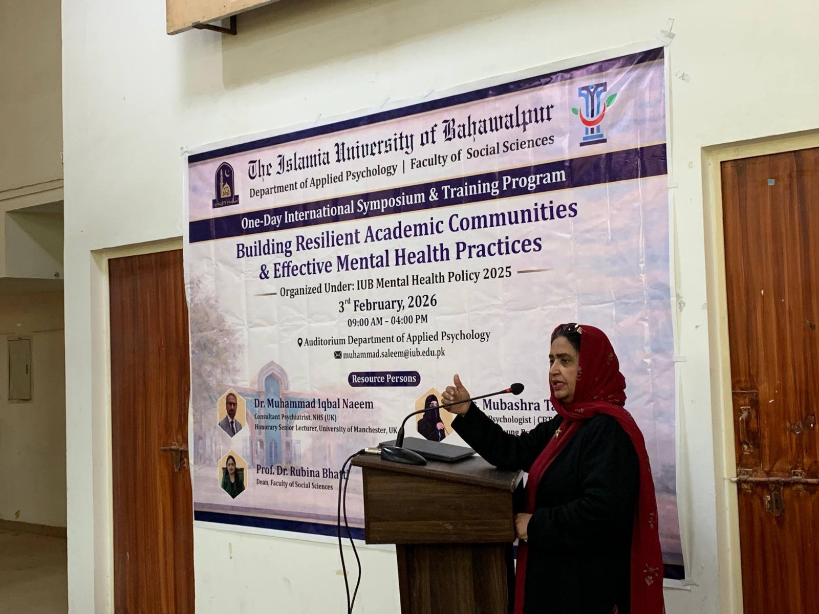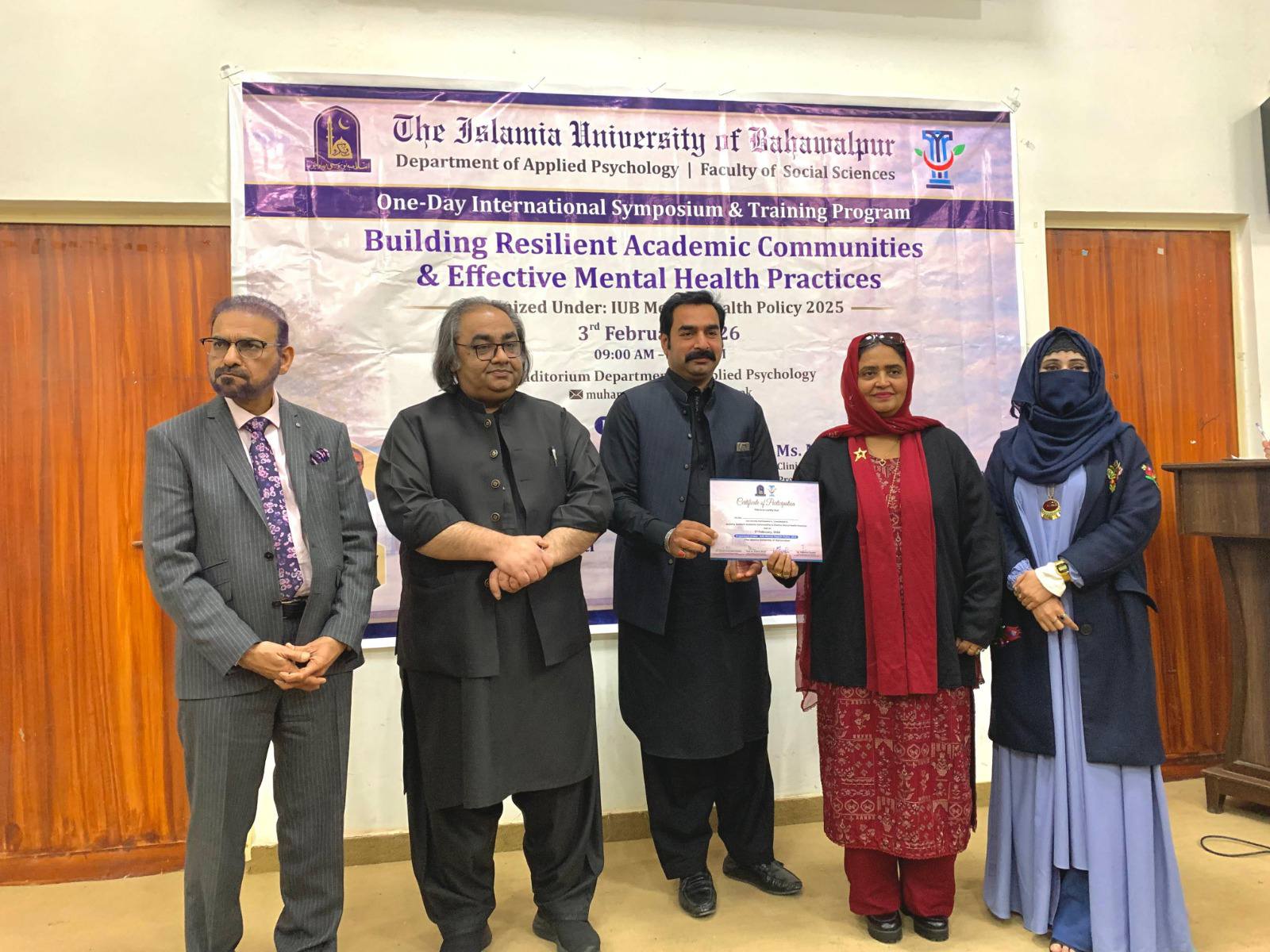 The Department of Applied Psychology, The Islamia University of Bahawalpur (IUB), successfully organized an International Symposium and Training Day on Mental Health on 3rd February 2026, under the umbrella of the IUB Mental Health Policy 2025 (V.1.0)—a landmark initiative marking the launch of the first ever Institutional Mental Health Policy at IUB.