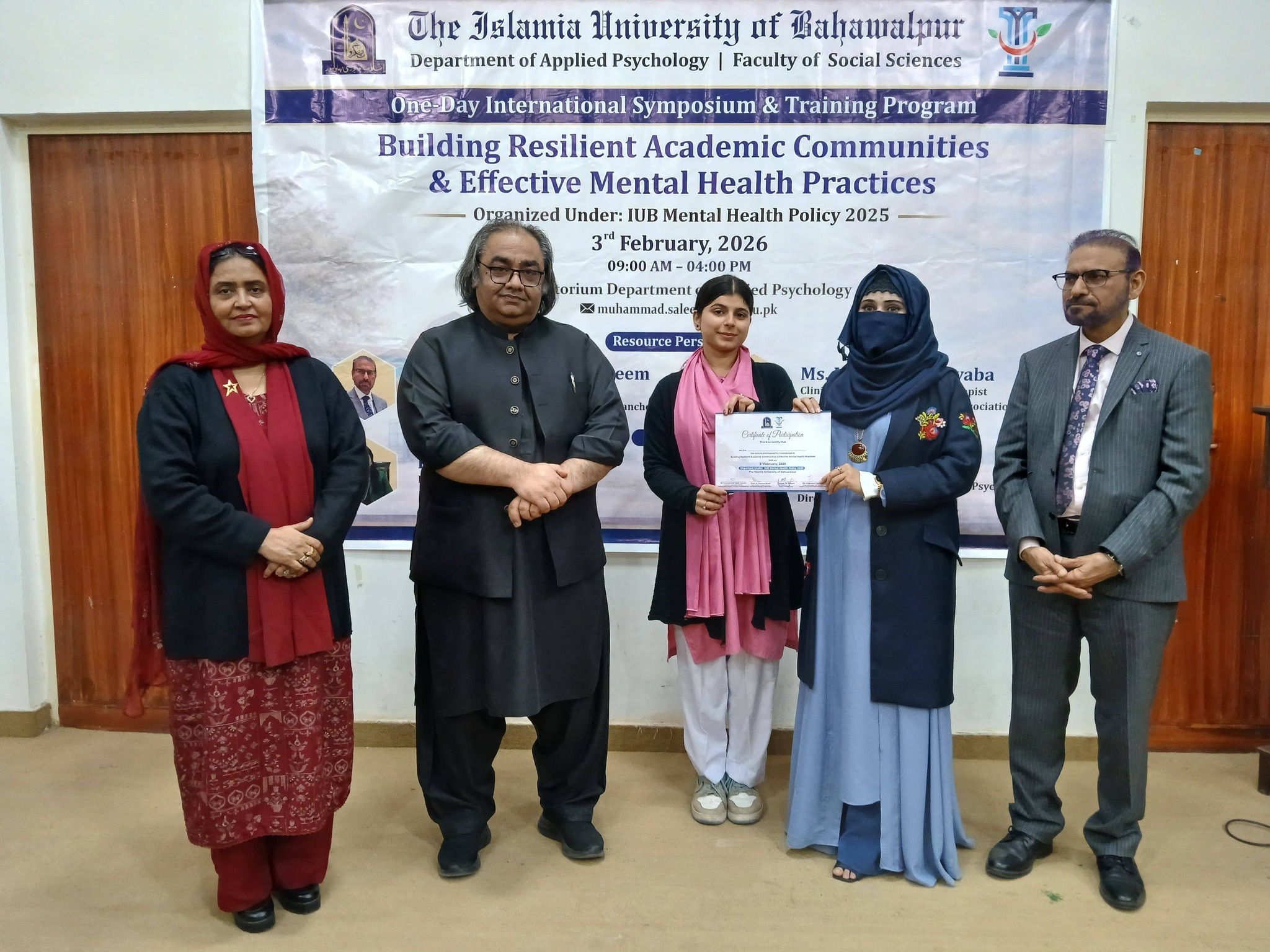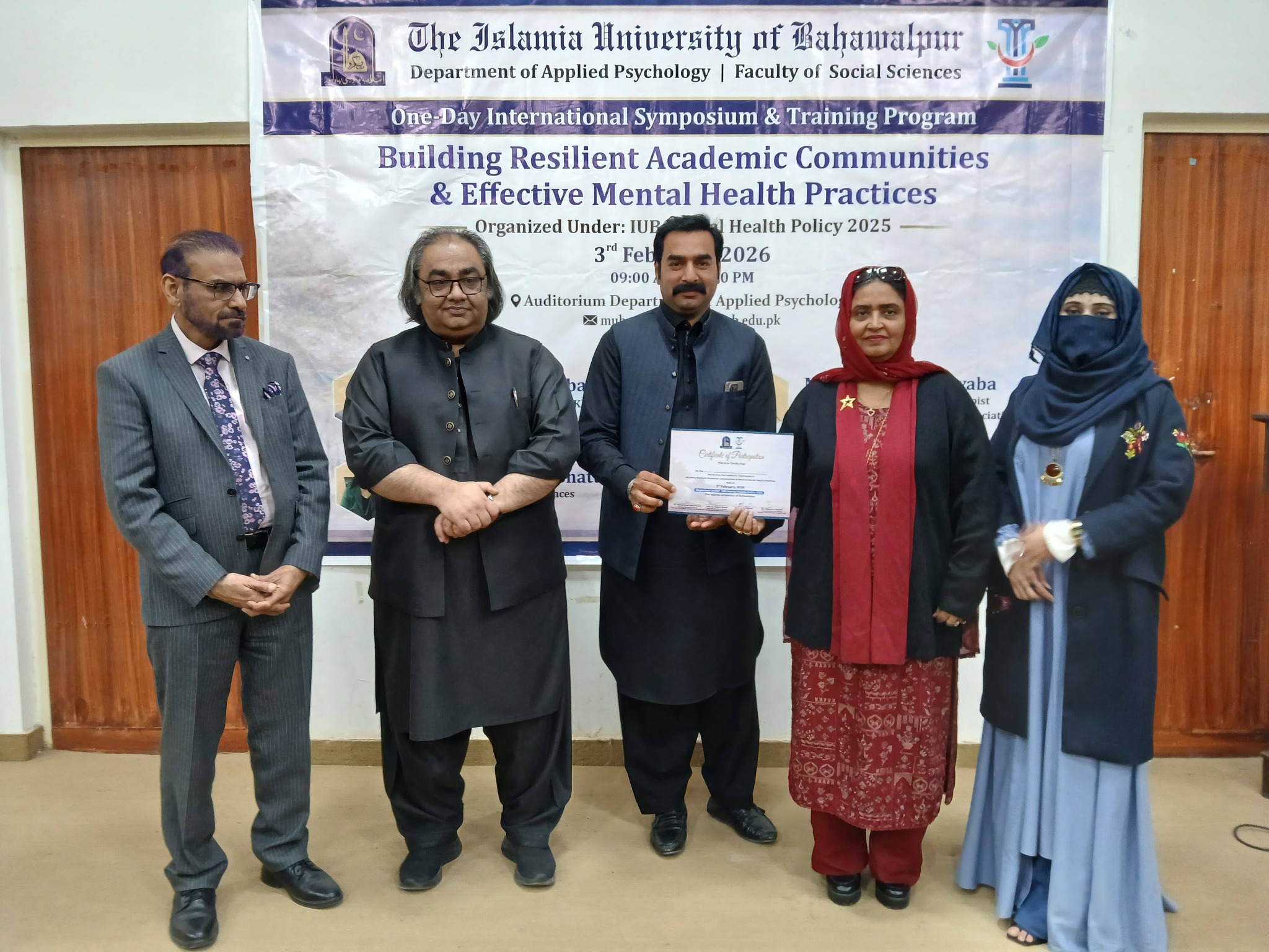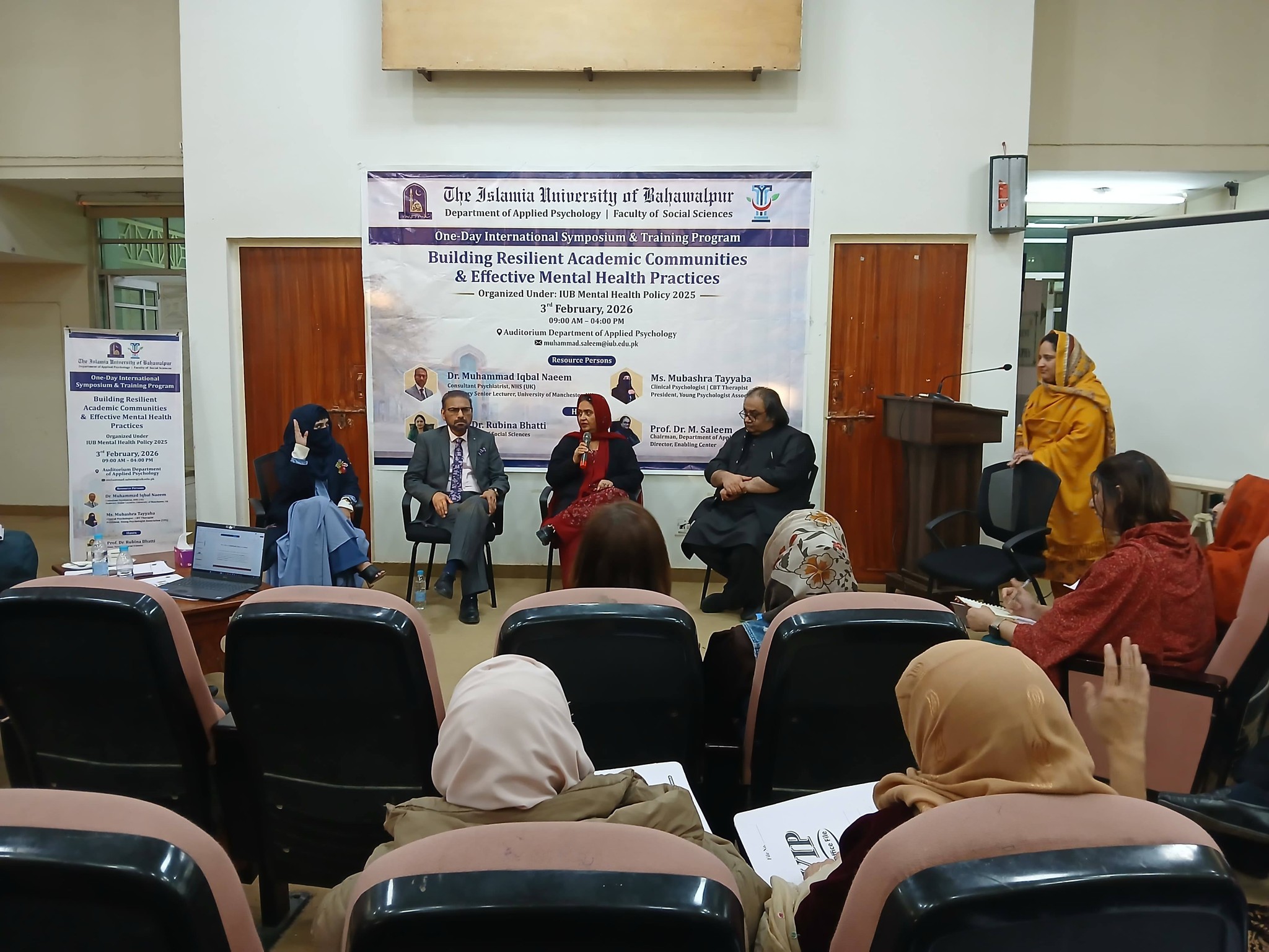 The Department of Applied Psychology, The Islamia University of Bahawalpur (IUB), successfully organized an International Symposium and Training Day on Mental Health on 3rd February 2026, under the umbrella of the IUB Mental Health Policy 2025 (V.1.0)—a landmark initiative marking the launch of the first ever Institutional Mental Health Policy at IUB.