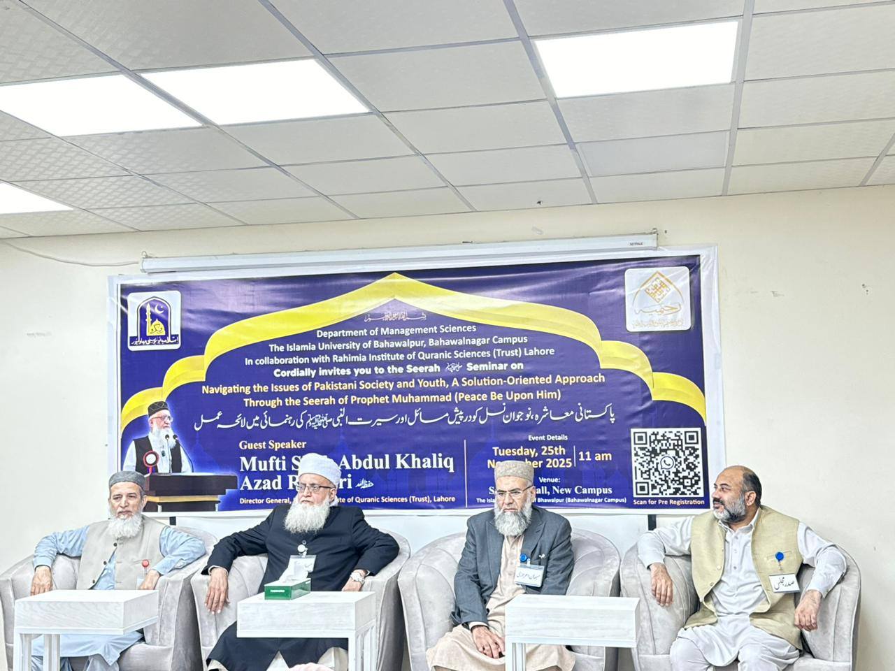 An intellectual and academic seminar on the subject of Seerat-un-Nabi (PBUH) was held at Islamia University Bahawalnagar Campus, which was organized by the Department of Management Sciences in collaboration with Idara Rahimiya. Teachers and students from various departments participated in the event.
