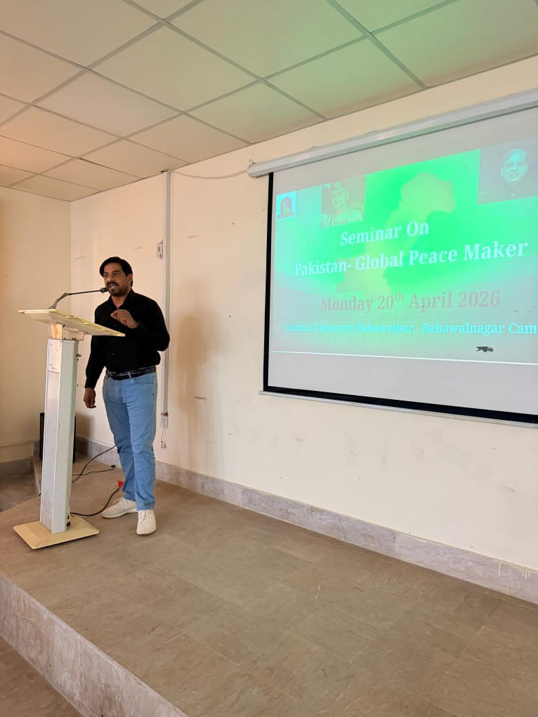 In accordance with the visionary leadership of Worthy Vice Chancellor Prof. Dr. Muhammad Kamran, the Islamia University of Bahawalpur (IUB), Bahawalnagar Campus, organized a prestigious seminar titled "Pakistan: A Global Peace Maker" under the auspices of the Directorate of Student Affairs. Presided over by Director Campus Dr. Rafaqat Ali.