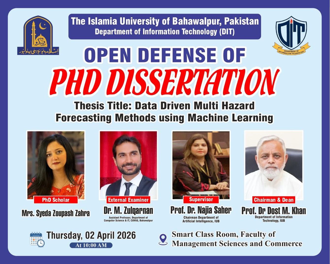 Open defense of Mrs. Syeda Zoupash Zahra, a PhD scholar from Department of IT, will be held on April 2, 2026